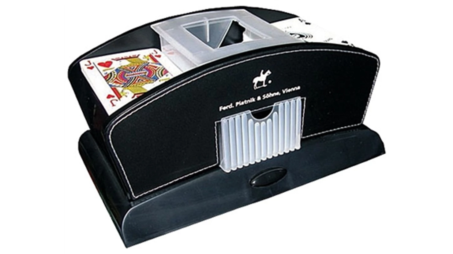 Minden standard méretű (maximum 91 mm magas) bridzs/römi/kanaszta vagy póker kártyához használható, műbőr borítású elemes kártyakeverő gép. 4 db AA elemmel működik. (az elemek NEM tartozékok!)