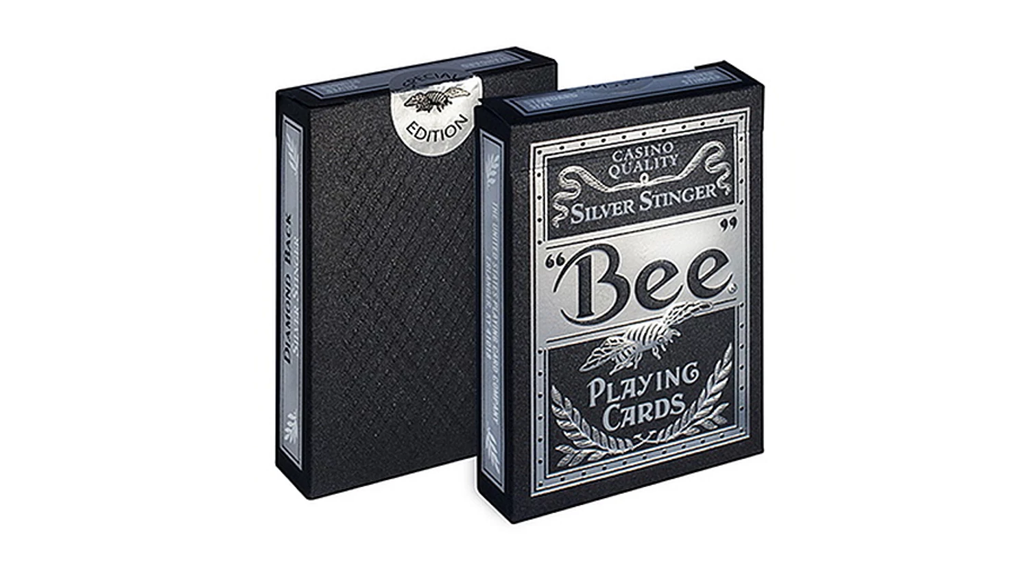 Premium edition Bee Silver Stinger playing cards have a cambric finish, thin crushed Premium grade stock and beautifully foiled and embossed tuck box.