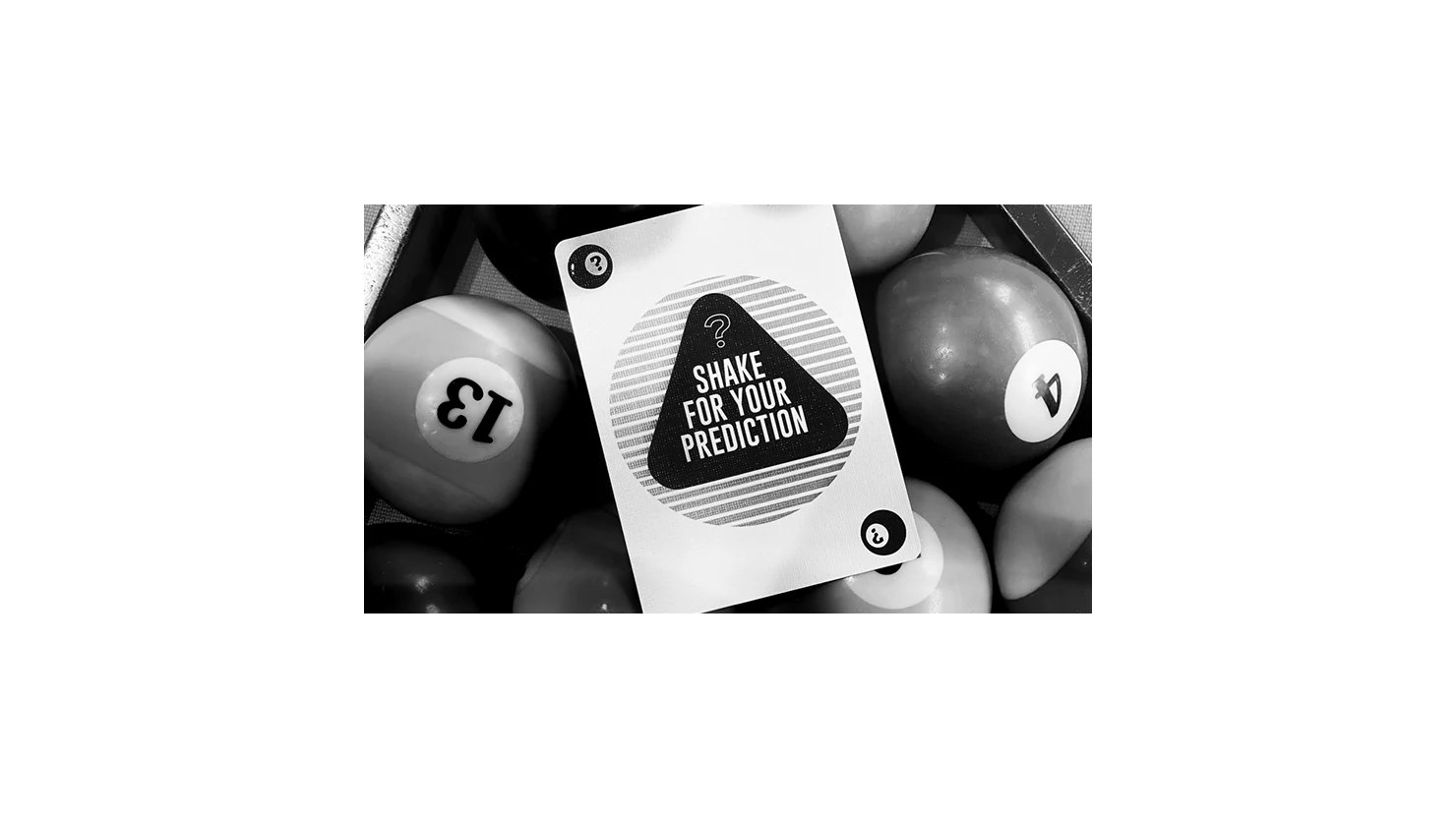 There are special gaffs included to create the 8 Ball Magic Trick. Shake for prediction, a reveal telling them what their card is, a reveal showing them where their card is and then a final kicker card for when they think they know what is going to happen! There is also an extra final reveal card allowing you to reveal the final location wherever you like, such as their back pocket or under their watch for example.