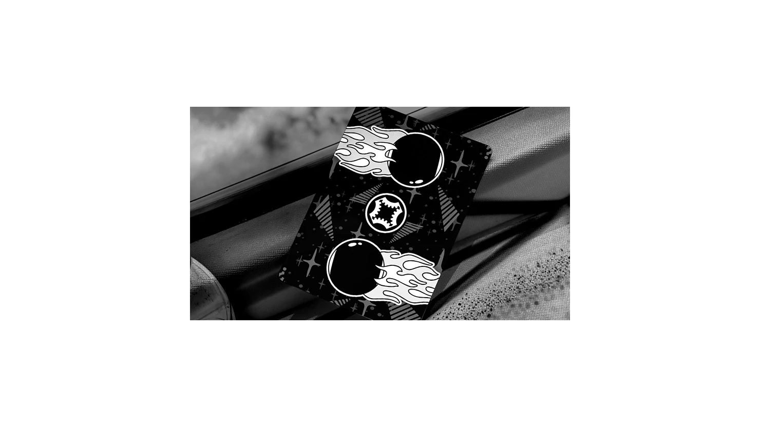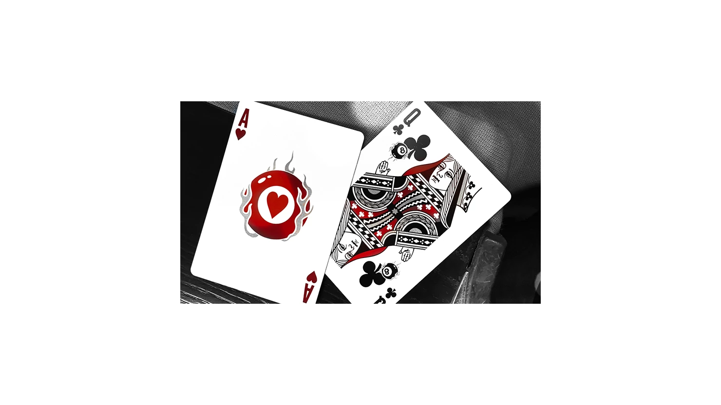 All Aces are custom, featuring the flaming 8 ball for clubs, hearts and diamonds. The Ace of Spades has further 8 Ball and pool elements.
