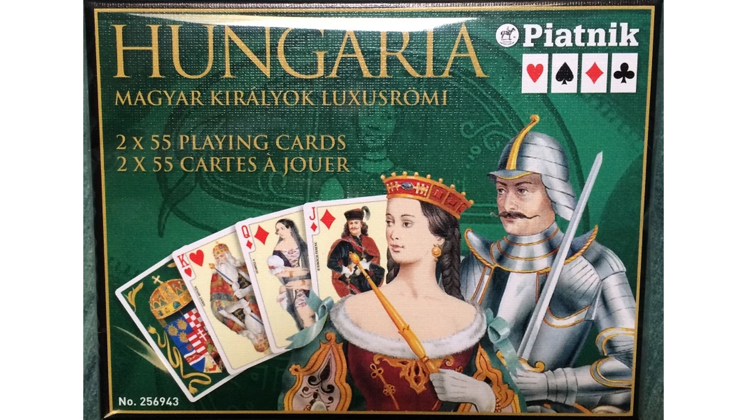 Gyönyörű kivitelű, műanyag bevonatú dupla csomagos kártya, híres magyar történelmi személyiségek képeivel, arany színű karton tokban. 1 kék + 1 piros hátlapú csomag, a történelmi koronás címerrel. Csomagonként 52 lap + 3 Joker, normál index 2 sarokban.