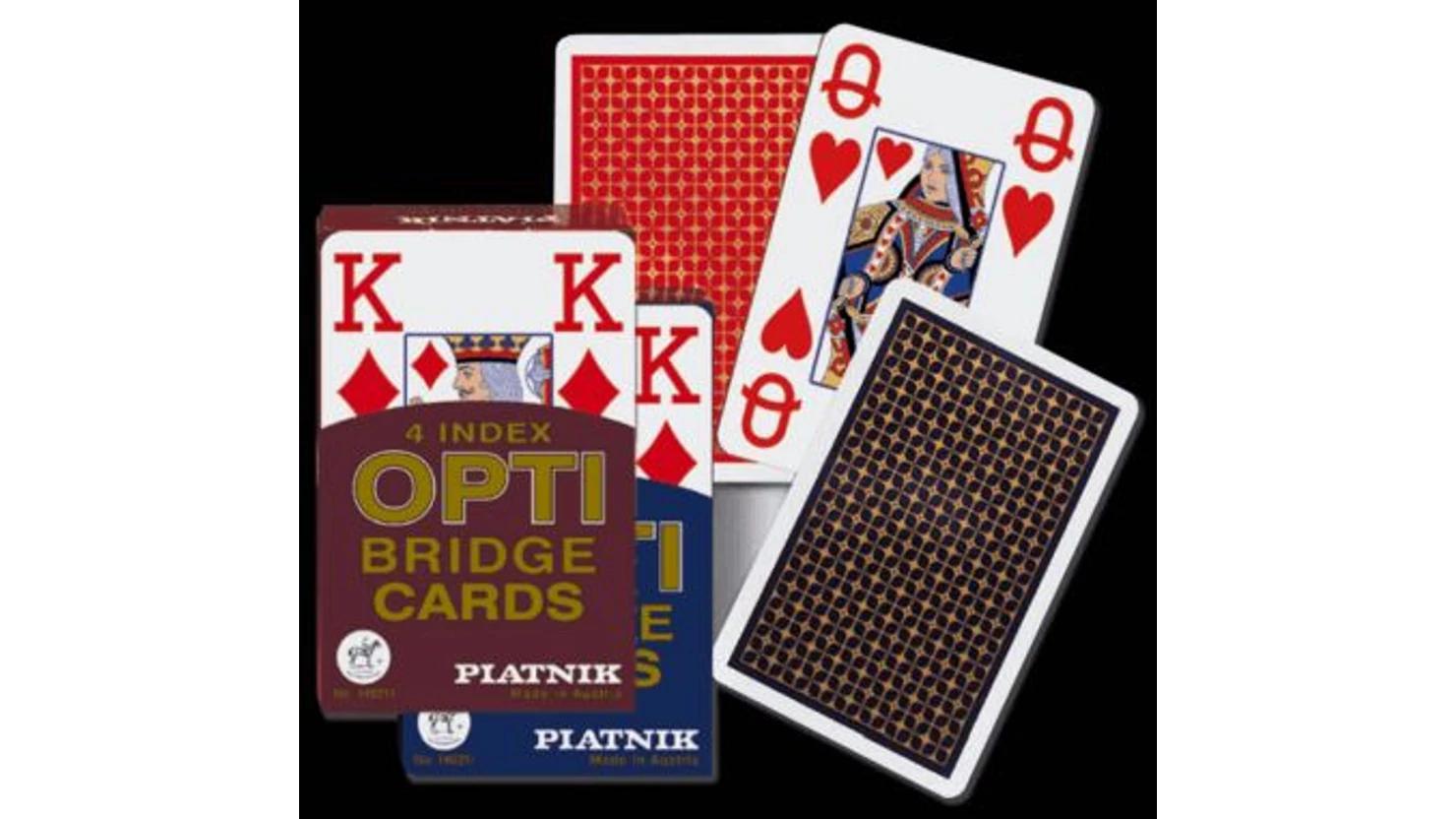 Műanyag bevonatú bridzs/römi kártya, egy piros/arany és egy kék/arany hátlapú csomag együtt. Csomagonként 52 lap + 3 Joker, Jumbo index 4 sarokban. Lapok mérete: 94*60 mm.