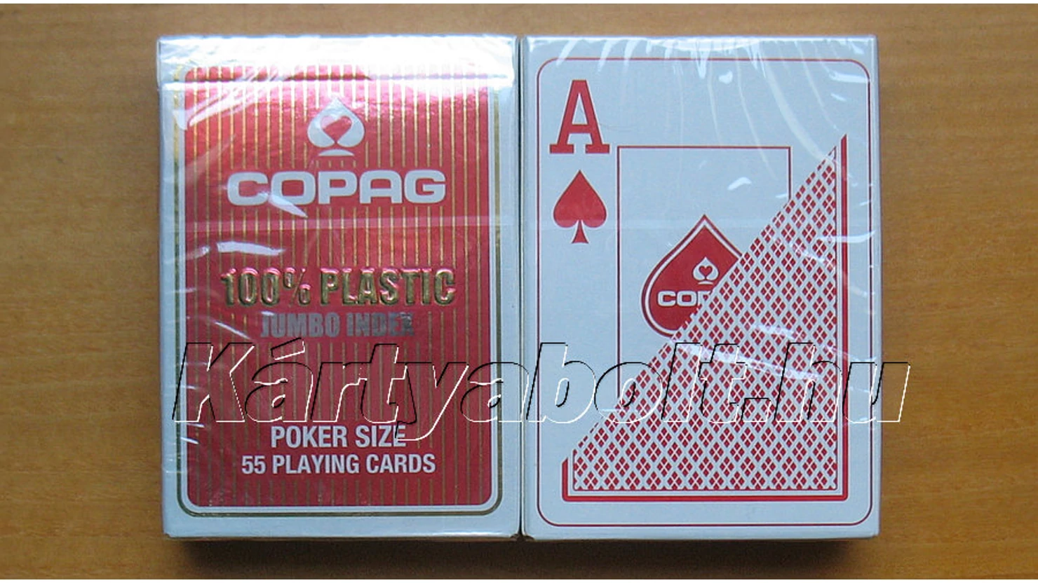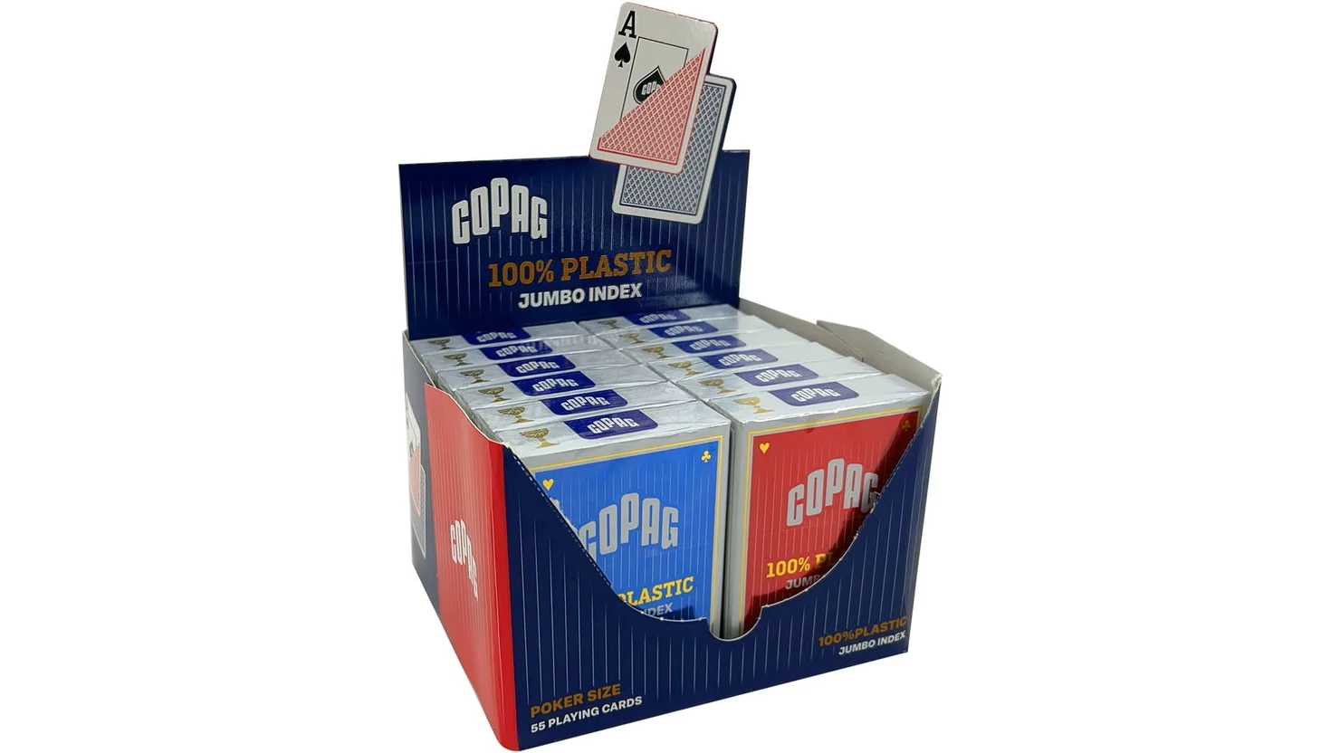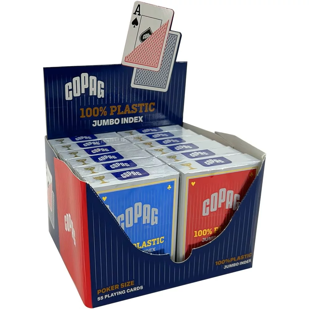 Karton kiszerelés. 100% plasztik póker kártya, 6 piros + 6 kék hátlapú csomag egyben, csomagonként 52 lap + 2 joker, Jumbo index 2 sarokban.