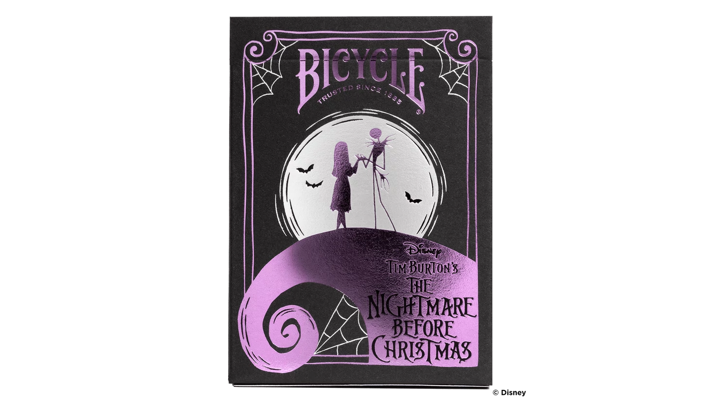Jack Skellington, Sally, and the rest of the residents of Halloweentown are here! Nightmare Before Christmas Inspired Playing Cards by Bicycle are filled with the haunting charm that only the mind of Tim Burton could create. Featuring spindly spiderweb foil on the tuck case and custom designed Jack Skellington card backs, your next night of cards will transport you to Halloweentown.