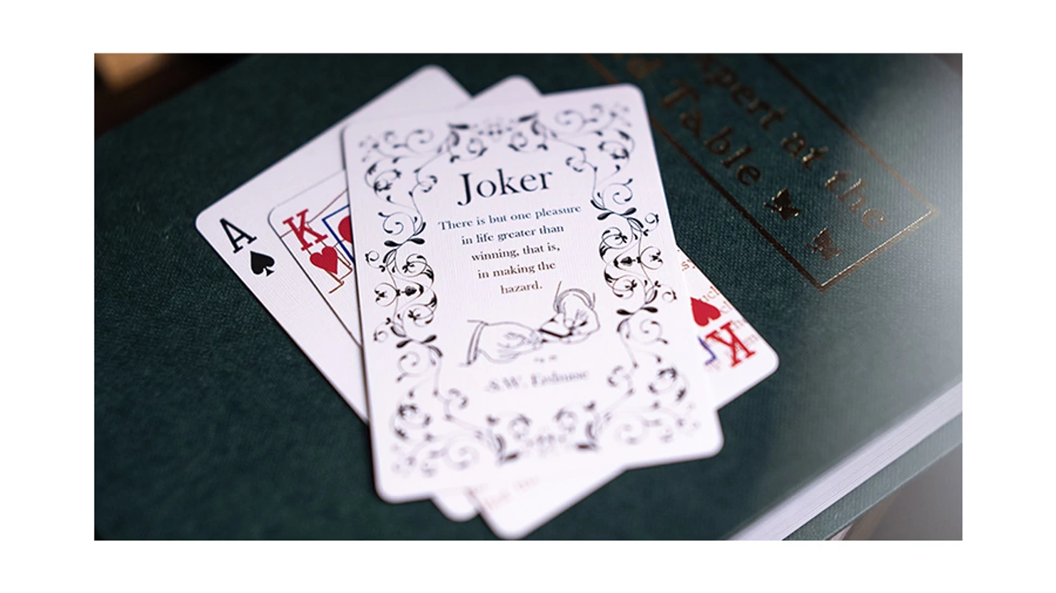 The custom Jokers use imagery from the deck's floral back design, along with two of the most popular and famous quotes from the book (one of them regarding the bottom deal's importance).