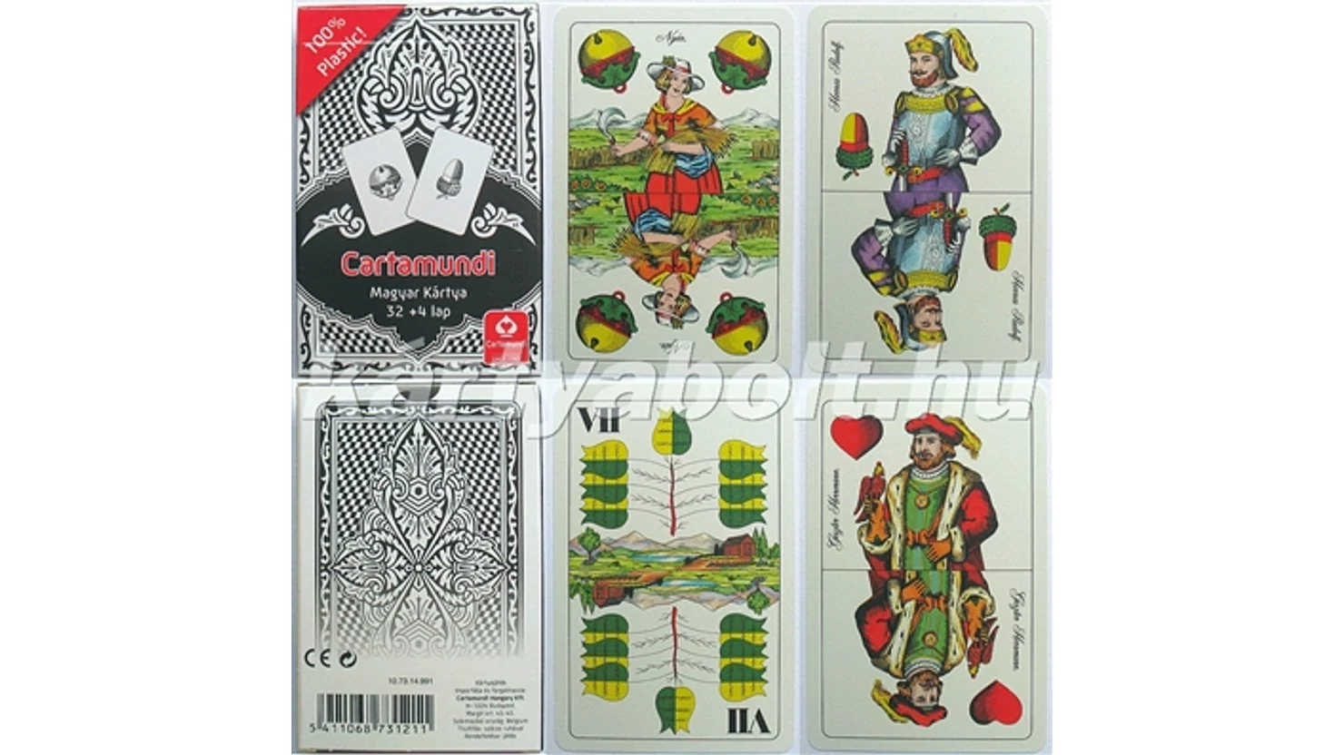100% műanyag alapú, 32 + 4 lap (minden színben egy 6-os a legalsó lap). A Magyar kártyával játszható legismertebb kártyajátékok: ulti, a snapszer vagy 66, a ferbli, a felsős, a zsírozás, a tartli, a makaó, a lórum és a kurucos. Lapok mérete kb. 64 x 100 mm.