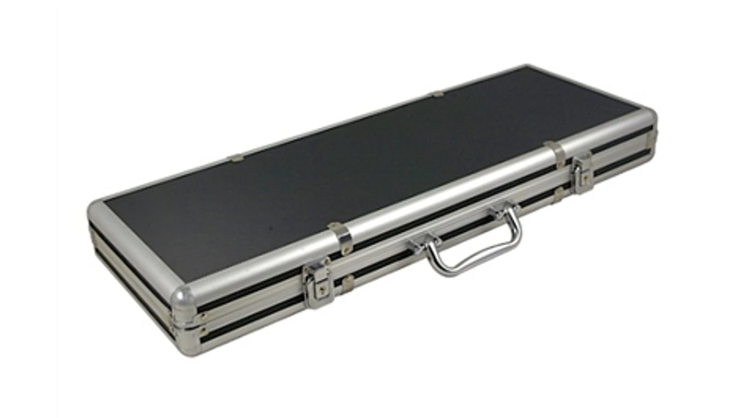 Igen szép kivitelű, üres, zárható alumínium zsetontáska, elegáns fekete rücskös műanyag borítással, 500 db zseton, 2 csomag kártya és 5 dobókocka tárolására.