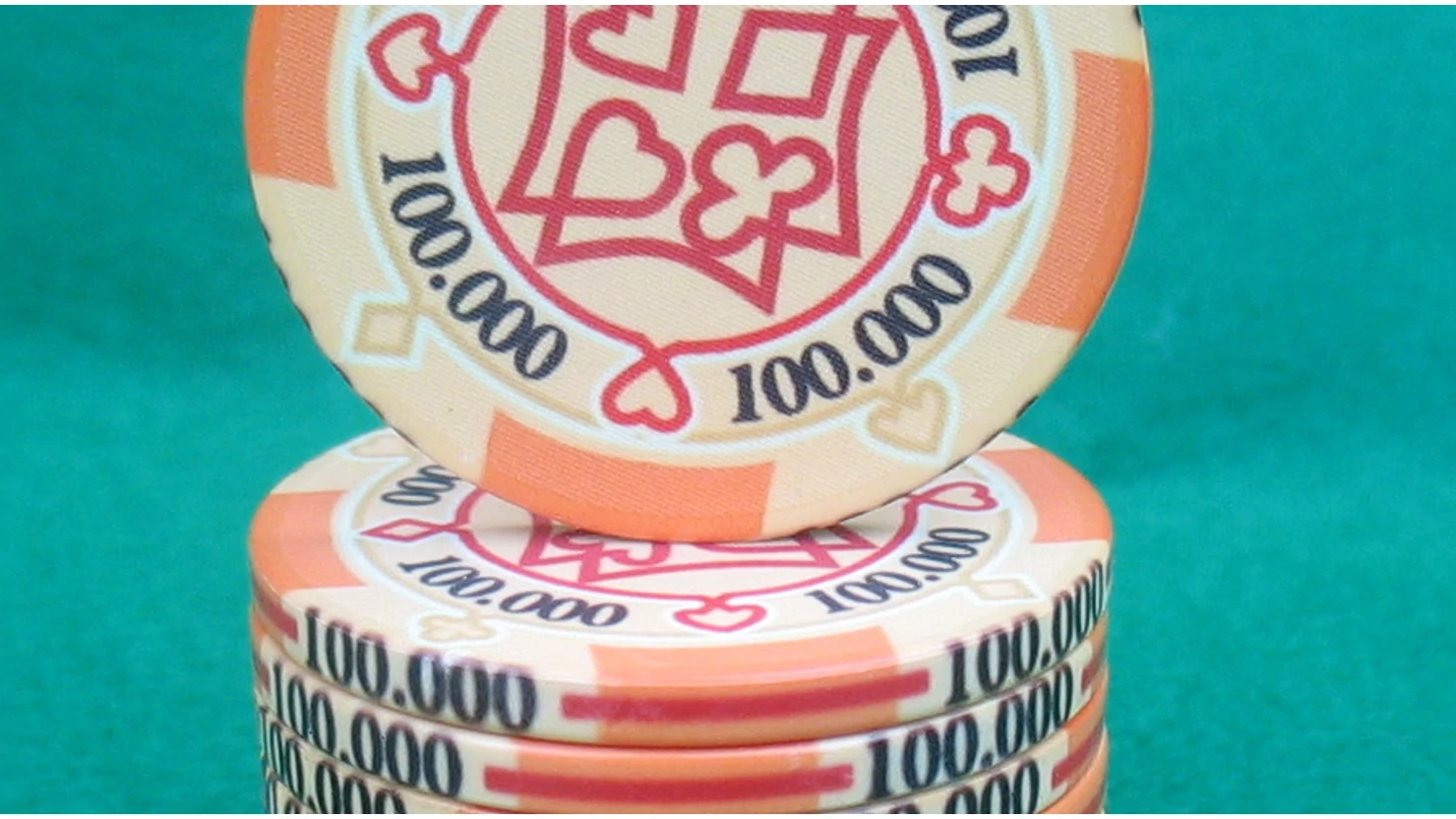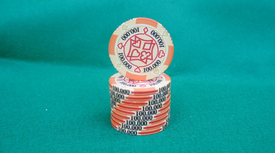 Cégünk saját tervezésű 10 g-os, igazított szélű kerámia zsetoncsaládjának '100.000' értékű zsetonja.