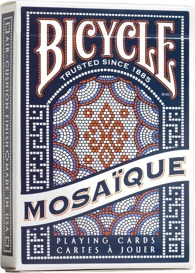 Inspired by the Mosaic art that decorate churches, Bicycle® Mosaique Playing Cards have a bright and intricate design that is vibrant and beautiful. The Court Cards are recolored to match the blue and red theme of the deck, and there is a custom Joker and Ace of Spades. Printed by the USPCC on premium Bicycle® card stock with their Classic Air-Cushion Finish for sharp Cardistry handling and shuffling